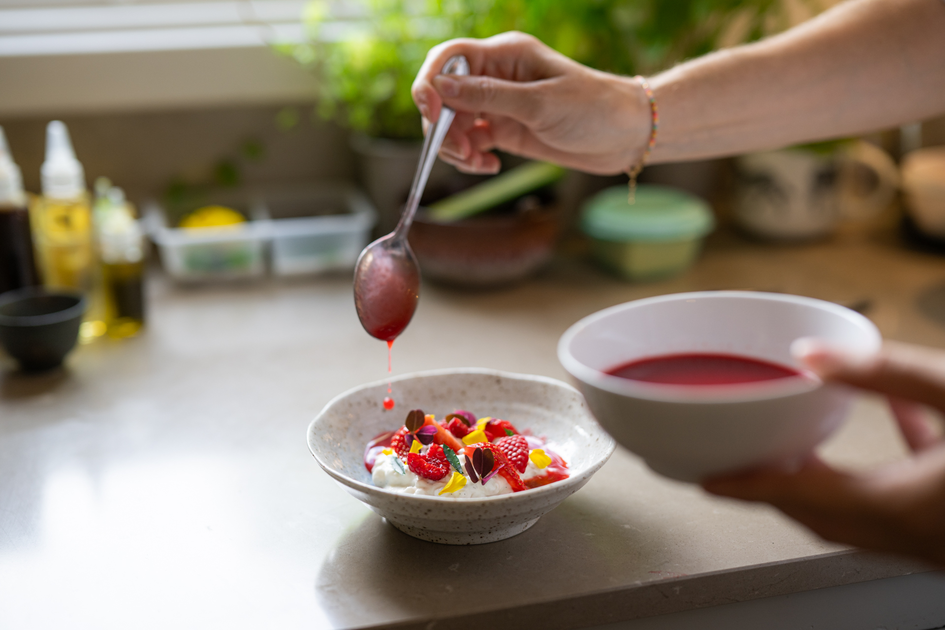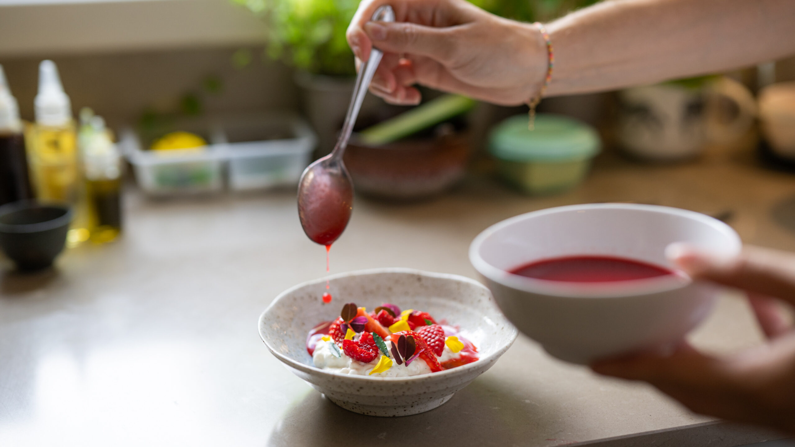 3. Häll hallonblandningen runt korn- och yoghurtblandningen. Dekorera med blommor och blad.